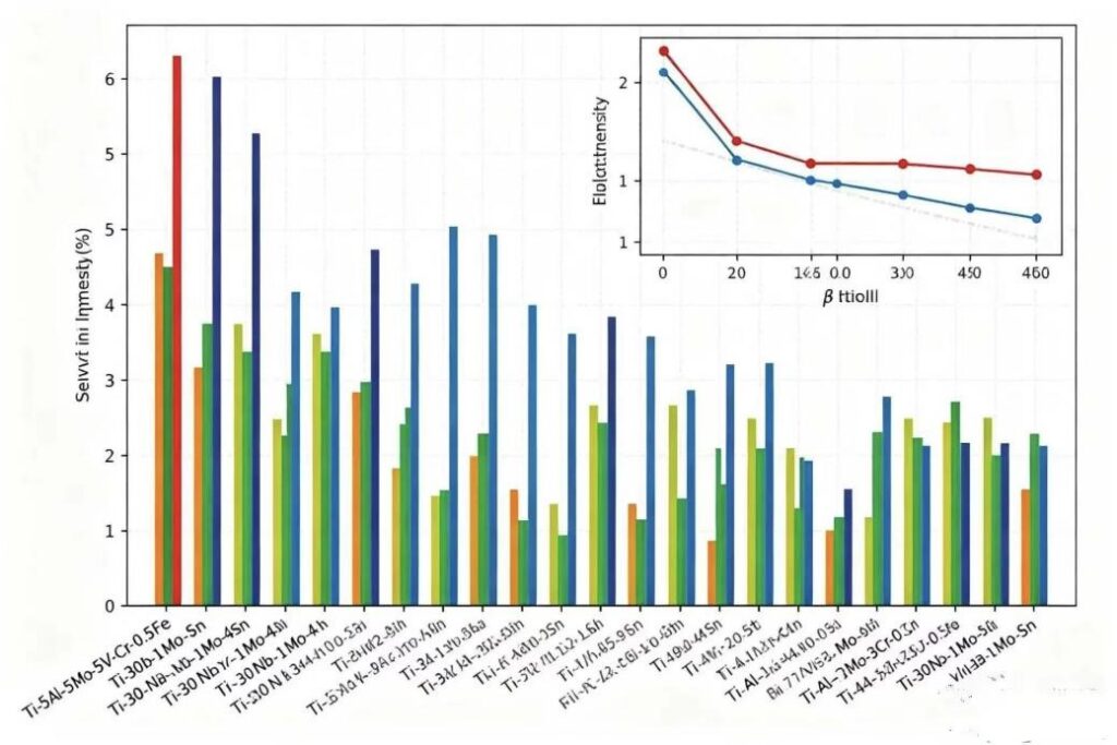 β-Titanium alloys include Ti-5Al-5Mo-5V-3Cr-0.5Fe Titanium alloy, Ti-5Ta-1.8Nb Titanium alloy, Ti-3Al-8V-6Cr-4Mo-4Zr Titanium alloy, Ti-4.5Sn-6Zr-11.5Mo Titanium alloy, Ti-8Mo-8V-2Fe-3Al Titanium alloy, Ti-30Nb-1Mo-4Sn Titanium alloy, Ti-15Mo Titanium alloy, TiNbTaZr Titanium alloy and Ti-13V-11Cr-3Al Titanium alloy etc.