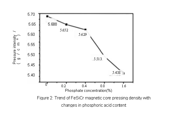 As can be seen from Figure 2, the pressing density of the FeSiAl magnetic core changes with the content of phosphoric acid. As the amount of phosphoric acid increases, the pressing density of the FeSiAl magnetic core gradually decreases. When no phosphoric acid is added, the pressing density is 5.688 g/cm³, and when 1.6% phosphoric acid is added, the pressing density is 5.438 g/cm³.