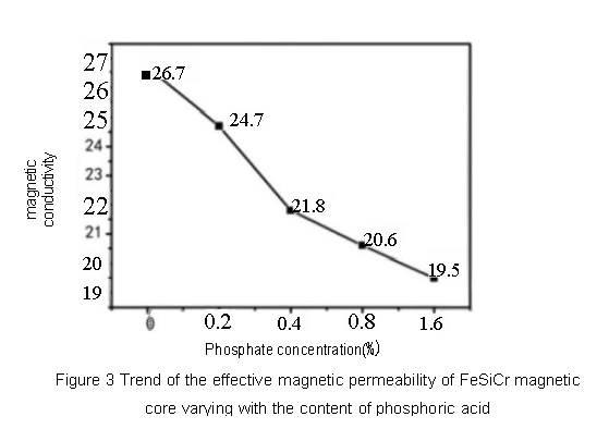 Figure 3 shows the trend of the effective permeability of FeSiAl magnetic cores with the change of phosphoric acid content. The effective permeability was measured using a high-precision LCR tester. The test voltage was 0.5 V and the test frequency was 100 kHz. It can be seen that as the amount of phosphoric acid increases, the effective permeability of FeSiAl magnetic cores gradually decreases. When no phosphoric acid is added, the effective permeability of FeSiCr is 26.7, and when 1.6% phosphoric acid is added, the permeability drops to 19.5.